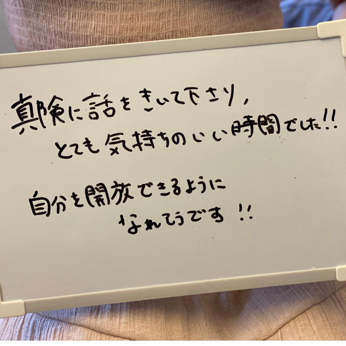 愚痴だったり自分の境遇なんかを手を止めてまでちゃんと聞いてくれました。感情が溢れてきても全部受け止めてくれたのが嬉しかったです。溜めていたものを素直に吐き出せたのは今でも不思議。