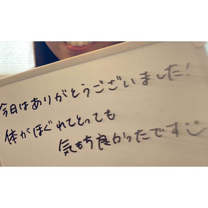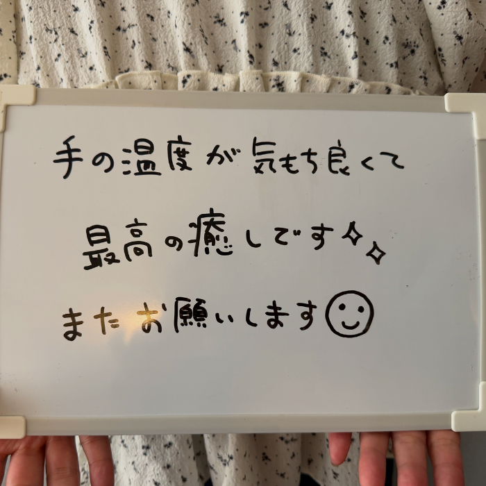 やっぱり最初は緊張しました。でも触れられていると安心感が出てきて最終的にはとても気持ちよく終わることができました。体もほぐれて最高でした!